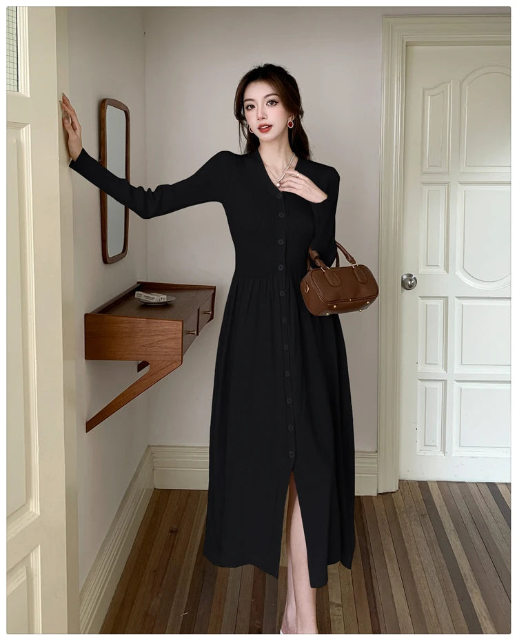 Autumn Vintage Knitted Dress for Women Elegant Single Breasted V-Neck Long Sleeves A-Line Party Dresses Slim Waist Vestidos New