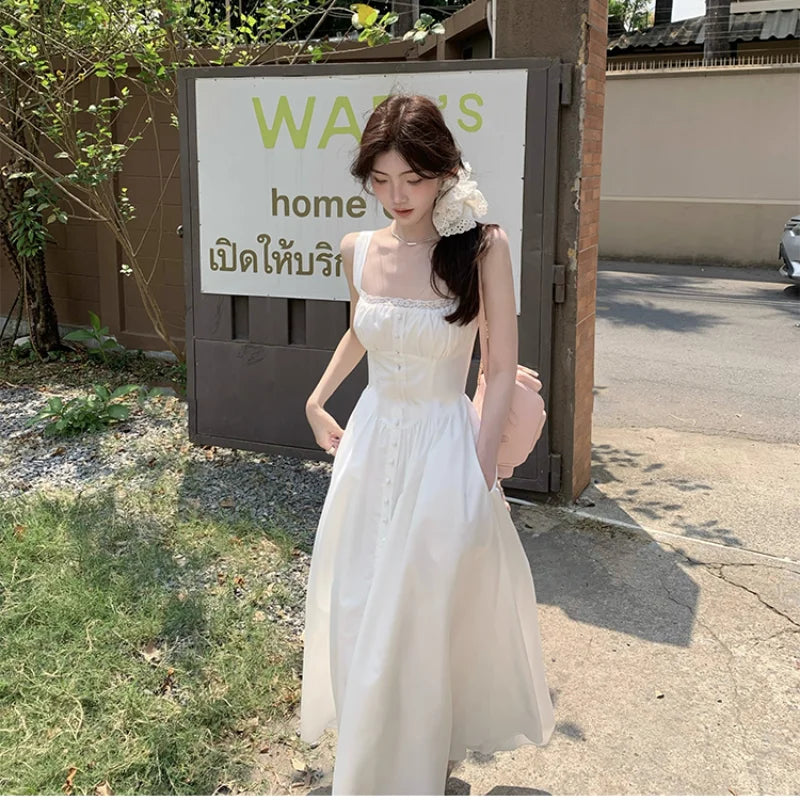 Elegant Beach Party White Midi Dresses for Women Summer New Korean Fashion Casual Sleeveless Slim Flower Female Clothing