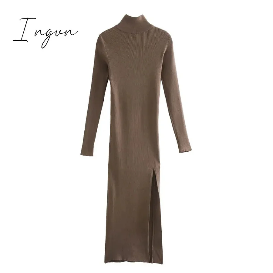 Ingvn - Vintage Elegant Brown Sheath Rib Dress Women Fashion Side Open Half Turtleneck Long Dresses Female Chic Vestidos